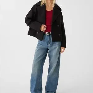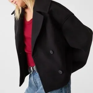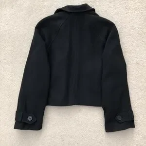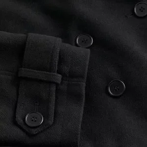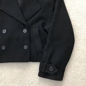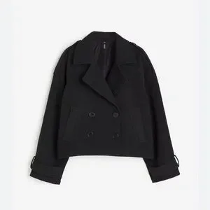 Loose fit, double breasted jacket in a woven fabric. Collar, lapels, buttons at front & diagonal welt pockets. Raglan sleeves with tabs at cuffs. Fully lined
