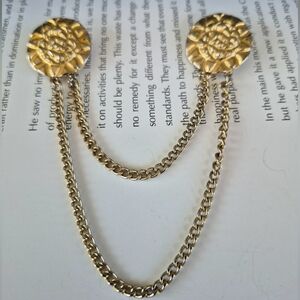 This double brooch, designed with chains, is an elegant accessory suitable for blouses, sweaters, and similar garments. Its versatile style enhances various outfits, making it a perfect addition to any wardrobe.