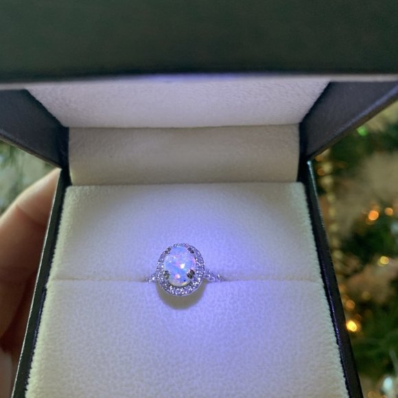 Double Claw-Set Oval Opal Halo Ring with Diamonds