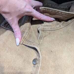 Vintage Double D Ranch vest in good used condition. This classic western piece features tan cotton denim construction with 11 metallic button closures (top button missing) and a traditional collar. Natural whiskering along the ribcage and subtle fading throughout add authentic character. The fabric shows intentional distressing with variations and thread pulls that enhance its genuine vintage cowboy aesthetic.