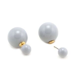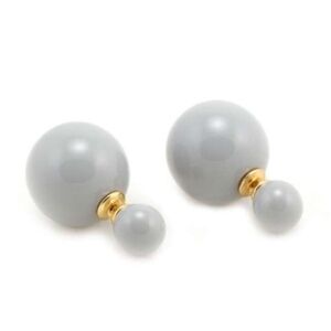 Golden hypoallergenic metal stud earrings with light gray glossy and shiny double synthetic pearl.