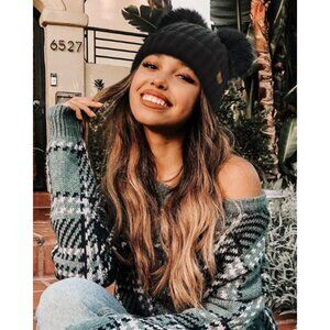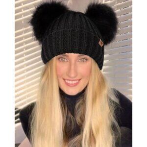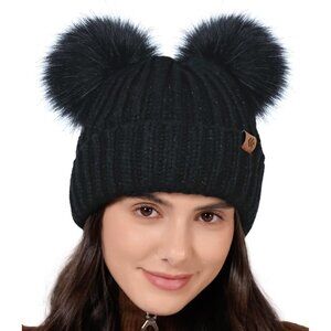 Double Pom Pom Beanie for Women Girls Warm Fleece Lined Knit Black Winter Hat