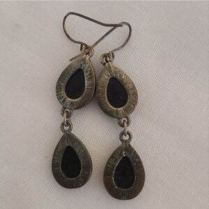 Dangle earrings with double teardrop shaped pendants. Black gem shape set in metal. Hook backing.