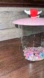 Clear glass mug with a pink lid featuring a red heart and wings. Colorful star confetti inside.