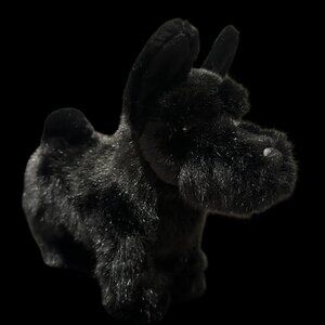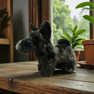 Bring home this adorable vintage black Scottie dog plush, a charming collectible that makes the perfect gift for dog lovers and plush enthusiasts alike. This soft, flocked stuffed animal features the classic Scottie with perky ears, a fuzzy textured coat, and a sweet, expressive face. Its small size makes it ideal for shelf display, nursery décor, or as a cozy companion for children or collectors.