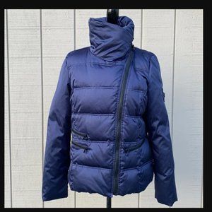 Gorgeous midnight navy blue asymmetrical zip down puffer jacket. 3 Front zippered pockets, 2 internal zippered pockets. Collar can be folded down or stands tall when fully zipped keeping your neck nice and toasty in those cold winters. Bulky black zippers.