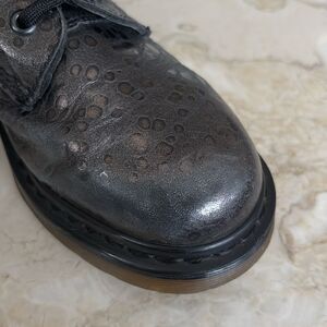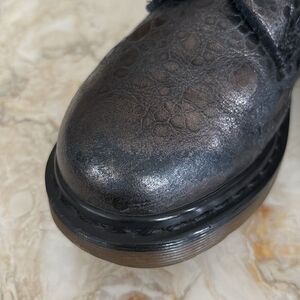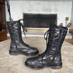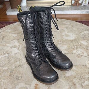 Rare Dr. Martens Lunar Crater 14-eye mid calf leather boots. Full length zipper at anterior sides for easy on and off. 10.5” from top to back of heel. These cool boots are in very good preowned condition, clean and ready to enjoy. Please be aware of some light wear around the toe as shown in close up photos, this isn’t noticeable and does not affect the integrity of the boots.