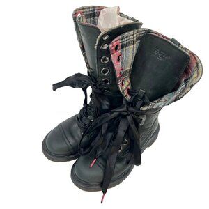 Brand: Dr. Marten | Triumph leather outer, plaid/tartan fabric liner, black ribbon laces, mid calf, good pre-owned condition. Normal marks of wear.