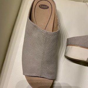Dr. Scholl sandal, size 7.5 US, suede upper fabric, light grey, white soles.