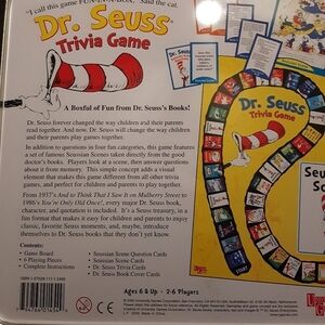 Dr Seuss Trivia Game, a pieces accounted for, a couple of the cards have minor wear, nothing that will take away from a fun game.