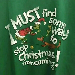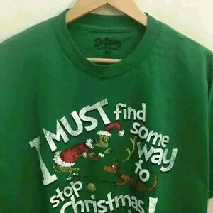 Dr. Seuss graphic novelty t-shirt "I must find some way to stop Christmas from coming" Unisex 100% cotton Has a hole on right sleeves but still in great preowned condition Size XL Shoulder 22.5" Pit to pit 23" Length 30"