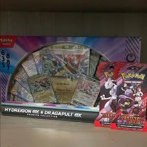 Bundle & Save! Get 2 Destined Rivals sleeved booster packs (with random artwork) FREE when you purchase a Hydreigon ex & Dragapult ex Premium Collection!