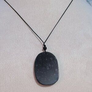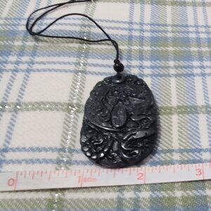 This is a genuine Black Jade carved into a Phoenix and Dragon amulet. It is natural black Jade, and measures 35mm x 49mm. It has an adjustable cord with a black bead. The other side of the jade pendant is smooth. The two figures are intricately carved and hand carved by skilled masters.