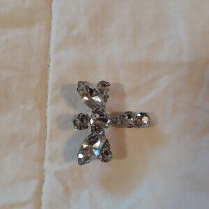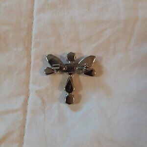 This cute dragonfly brooch is made of a sparkling glass, and has an easy to use pin. 1 1/4 inch long and wide. The brooch boasts silver tones, and is in good condition.
