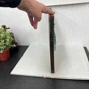 Created on dark stained wood, this piece measures 11.5" x 12" and is perfect for those who appreciate the beauty of handcrafted art.