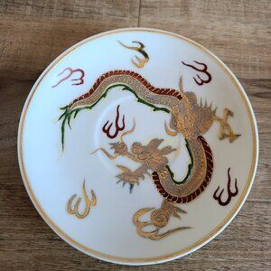 Vintage 1940s Dragonware Kutani porcelain cup and saucer with marriage raised, three-dimensional dragon designs. Cup is 3 3/4'' wide, 2'' tall. Saucer is 5 3/8'' wide. Cup has 2 little black spots inside (?). Very delicate porcelain. Signed S.P.P.