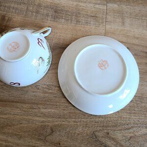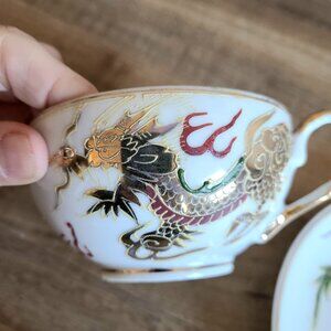 Dragonware Kutani porcelain cup and saucer with marriage dragon design.