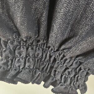 Knee length and elasticated knees, elastic waist with a tie belt at front, no pockets.