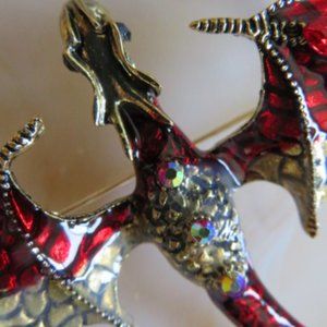 Sparkly red and gold metal alloy dragon brooch with rhinestones on wings, back and tail.