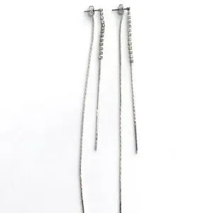 Ultra-long silver-tone threader earrings with a rhinestone accent bar and delicate double chain drop strands. Lightweight with high sparkle and movement. Perfect for adding a statement touch to minimalist and evening looks.