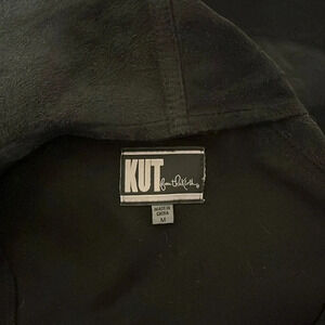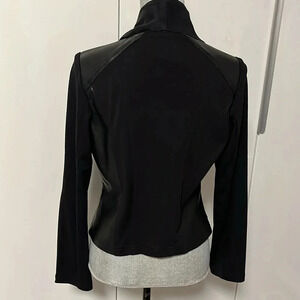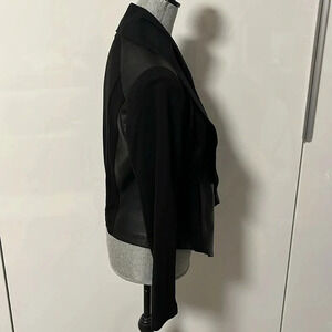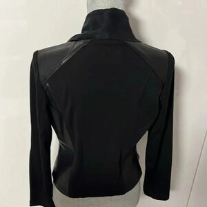 Black faux leather and poly rayon blend open style jacket stretch material. A fitted style with side pockets and oversized collar. Back sits at waist and front collar is longer. A nice asymmetric shape. New never worn. This open style cardigan jacket looks beautiful styled with trouser pants or even jeans for the weekend. Just through on and go to look polished.