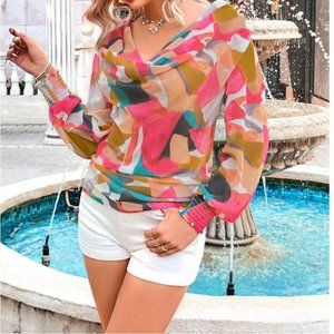 Draped Neck Shirred Cuff Graphic Print Chiffon Top