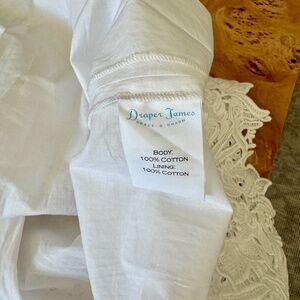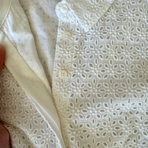 Reese Witherspoon’s Draper James in collaboration with Net-a-Porter, white eyelet midi shirt dress with beautiful embroidery on bottom hem.