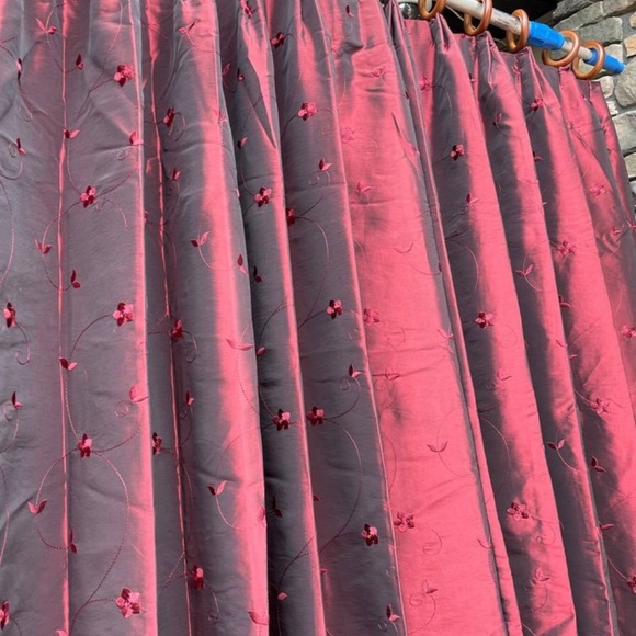 B. 2 panels of the red pure silk draperies with wooden curtain rings. Fully lined. 22” wide x 87” long. $300 for the pair.