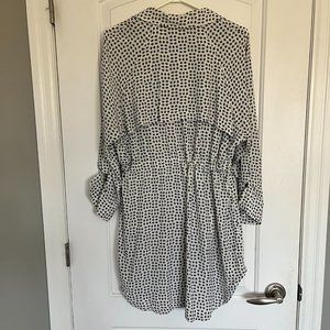 Lovely shirt dress by brand Cartonnier. Fabric is off white with black and blue pattern. Has a tied at the waist and long sleeves.