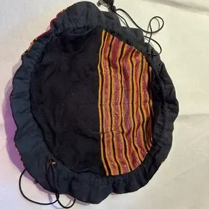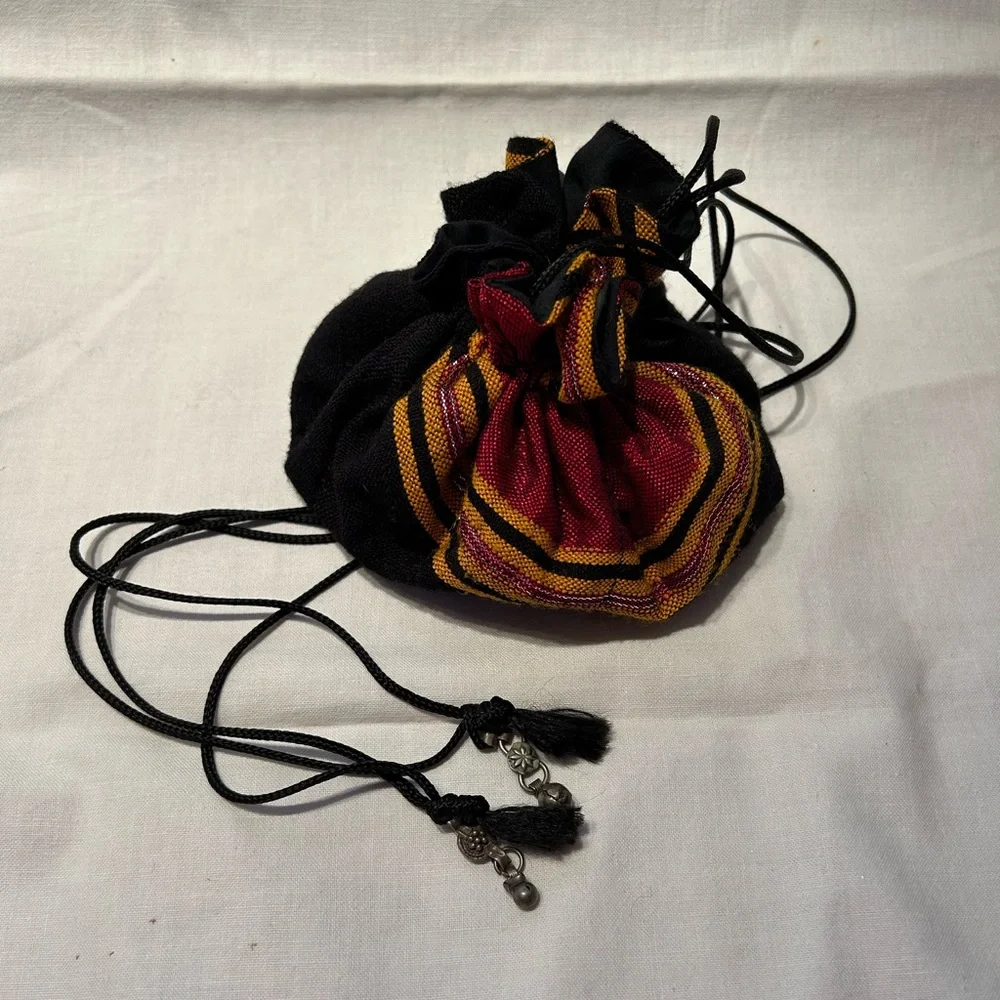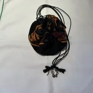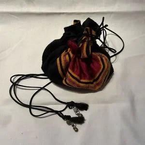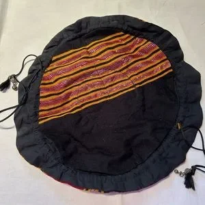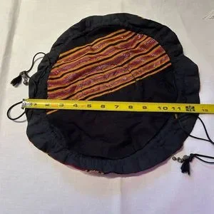 Very fun & pretty bag - originally from the Middle East, I believe it is a jewelry storage bag; but, the size, straps & colorfulness make it a great evening bag. The straps are ~18” long, when open the bag is ~12” round and has 8 little pockets. It is in very good condition.