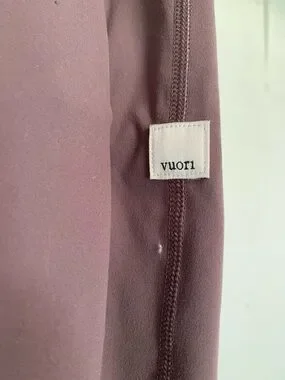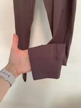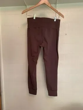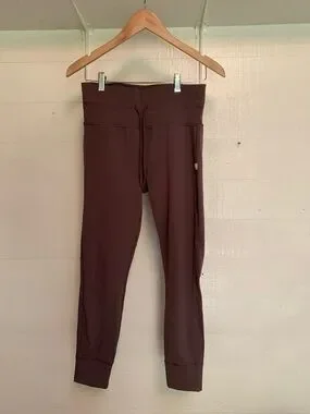 Comfortable brown/purple leggings with a drawstring waist and seamed ankles. Soft, flexible fabric. Neutral colour works well with many tops for everyday active wear.