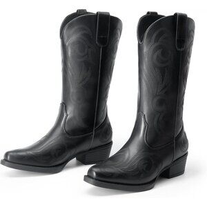 Dream Pairs Women's All Black Mid Calf Cowgirl Boot Square Toe Chunky Heel Shoes