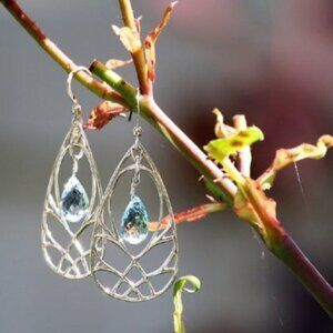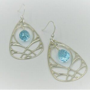 Dream Weaver Earrings with Swiss Blue Topaz Faceted Gemstone and Sterling Silver Frames. Length 2.5 inches. Available with following Gemstones; London Dark Blue Topaz, Pink Ruby, Yellow Citrine, Blue Lapis, Moonstone, Larimar, Purple Tanzanite. Also available with Gold Fill Frame. Same Price.