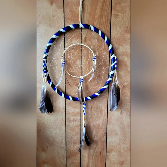 Large blue Dream Catcher. See measurements in photos. Feathers not pristine (see photo), but the Dream Catcher taken in its entirety is really nice.