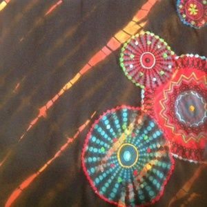 Fitted stretchy dress with tie dye look and fabric paint details. Can be worn as short mini or with leggings.