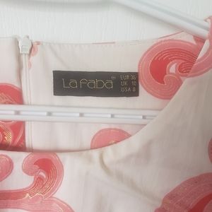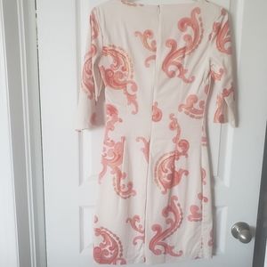 Very cute spring or summer dress. Sleeves are 3/4 length, bottom is just above the knees. Very flattering piece.