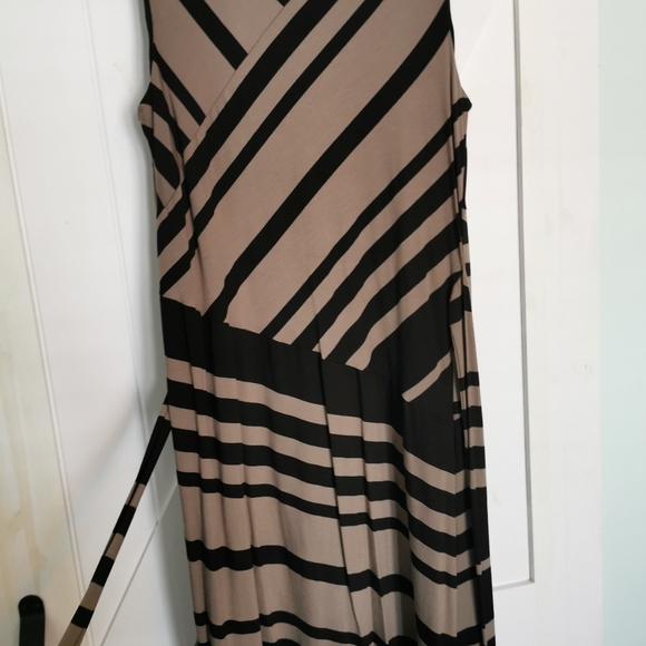 Knee length, comfortable, belt, scoop neck. Beautiful lines makes it very flattering!