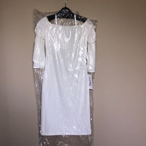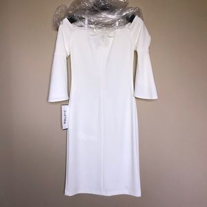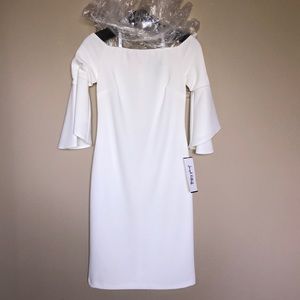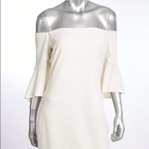 Off the shoulder dress with bell sleeve detail - crepe material lined with mesh. Very comfortable and true to size. NEVER worn.