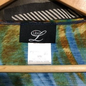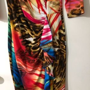 Form fitting multi-colour print dress, with front ruffle, 3/4 sleeves. Light weight. Great piece for a dinner out or travelling in the Caribbean.