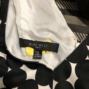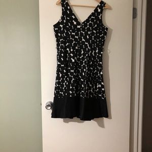 V-neck, A-line dress, black and white polka dots, with a optional tie sash. Bodice is lined, and shoulder straps have hook and eye to hold bra straps in place. Skirt flares and is a fun piece to wear for any occasion.
