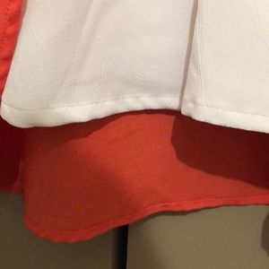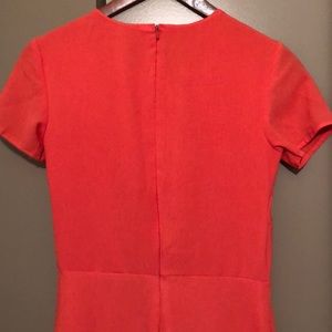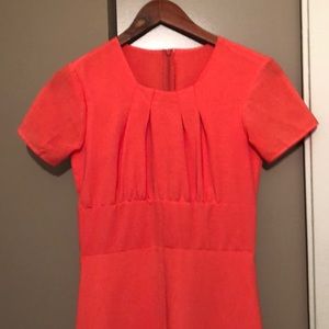 Coral, short sleeves, invisible zipper in the back. Skirt is double layered. Front bodice is pleated