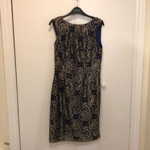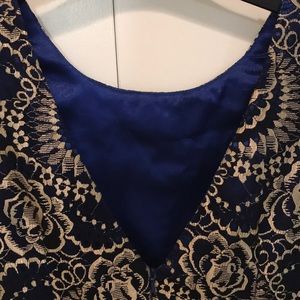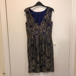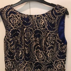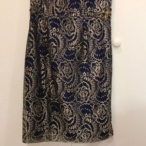 Midnight blue silk interior with gold overlay. Diamond shaped, beaded detail in both hips. 16.5 inches across the chest. 39 inches in length.