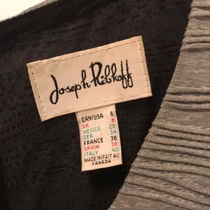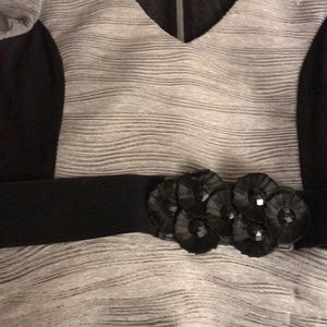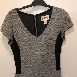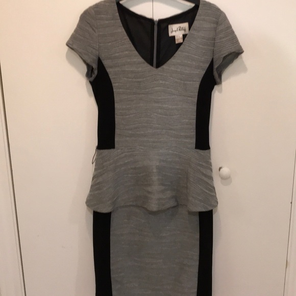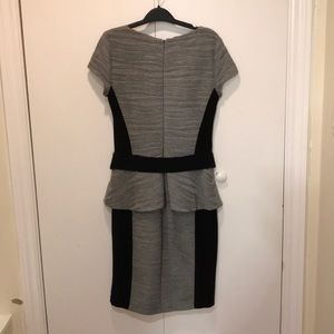 Textured, professional, grey and black dress with peplum detail. Some stretch in this garment. Flattering cut. Detachable belt detail. 18 inches across the chest. 40 inches from shoulder to bottom of skirt.