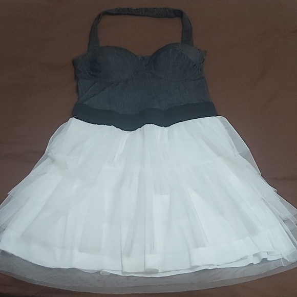White mesh bottom, black attached waist band, black washed upper chest with halter strap dress.