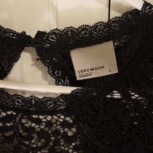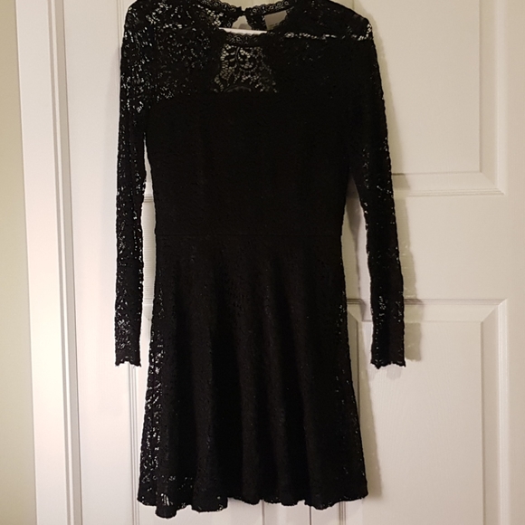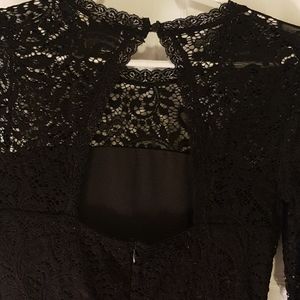 Very sexy Lacey black dress. Keyhole back. Exposed lace on arms and above bra line. A line dress, flowy bottom. Very fun dress! Only worn a couple of times.