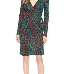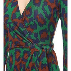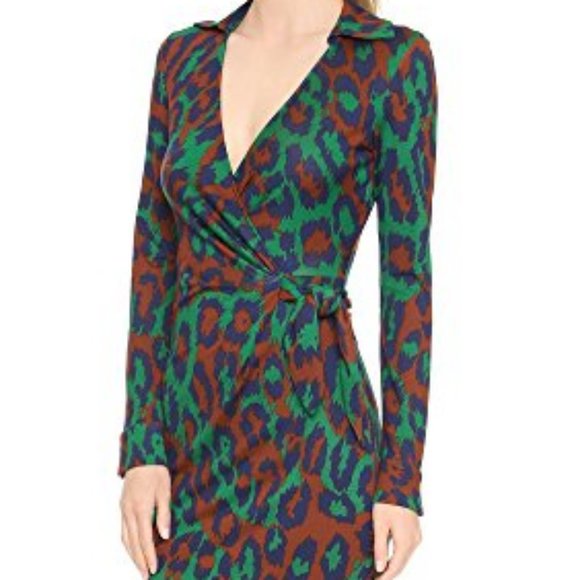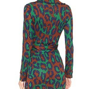 A print Diane Von Furstenbeg wrap dress in luxe silk jersey. Fold-over collar and self-belt tie. Long sleeves. Unlined. Size 4.