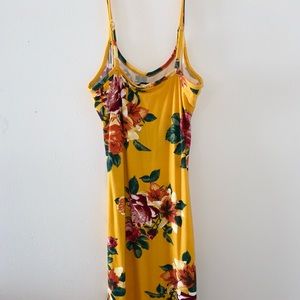 Printed midi dress Available in mustard floral Adjustable spaghetti straps Stretch 96% polyester 4% spandex