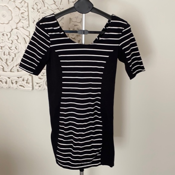 Short sleeve, tight dress. Made of cotton and spandex. Slim look given design. Small scoop back with small zipper. Worn once