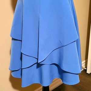 Beautiful fitted blue dress. Great for summer gatherings or just sitting on a patio. Criss-cross straps give it great appeal from the back. Layered skirt in the front. Falls just above the knee.