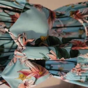 Ardene summer dress with spaghetti straps and flared skirt. 'Open' back with tie detail. Aqua background floral print. Size X small.